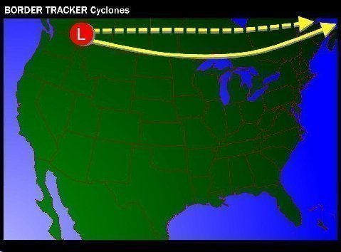 Associated Sensible Weather: High winds along and north of 40°N latitude; very strong warm advection along and south of storm track; precipitation usually sparse within the warm sector, except in cases during the “January Thaw”; Border Tracker storms in mid-January may draw in deep tropical moisture from the Gulf of Mexico, resulting in widespread overrunning and convective rainfall along and to the right of the trajectory of lowest surface pressure falls. Locales close to the actual storm track may see mixed or icing precipitation, with snowfall relegated to Canadian communities affected by the disturbance. Storms of this track type can be prolific severe thunderstorm producers in southern Canada and the northern Great Plains during the summer months.