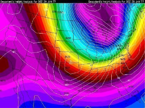 Associated Sensible Weather: One of the most misunderstood of all storm tracks. A true Alberta Clipper exhibits a rapid and parabolic motion. Accompanied by sudden deepening and intense winds at most levels of the atmosphere to the right of the Rocky Mountains. While moisture may be lacking, a typical clipper can generate ground blizzards with rapid advection of cold air along and in the wake of its passage. Cold and overrunning sector snowfall is usually about 1 - 3 inches, although maximum amounts of 8 inches are not unheard of. Unlike many mid-latitude cyclones in North America, the heaviest snow is generally seen along and just north of the path of maximum vorticity at 500MB.